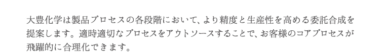 大方科学は製品プロセスの各段階において、より精度と生産性を高める委託合成を提案します。適時適切なプロセスをアウトソースすることで、お客様のコアプロセスが飛躍的に合理化できます。